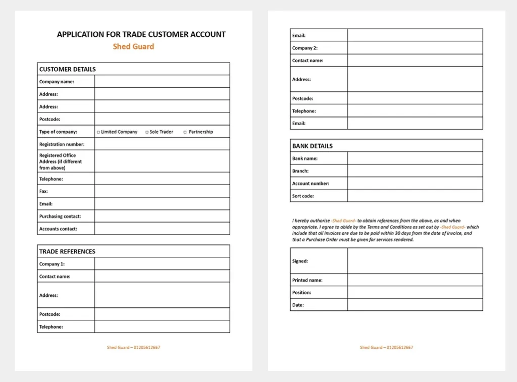 At Shed Guard, we value strong and trustworthy relationships with our trade customers. To offer you the convenience of credit terms, we require some essential details to assess your creditworthiness.